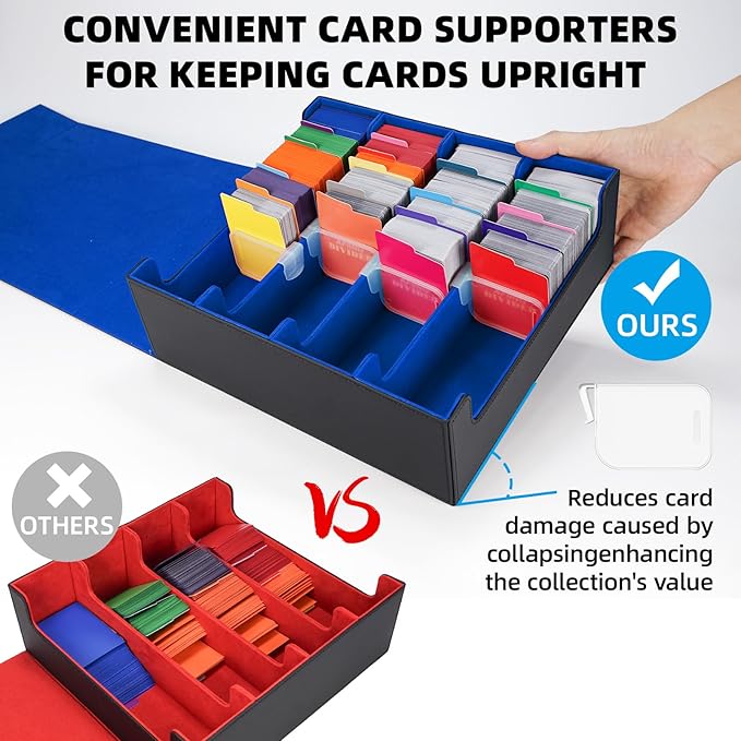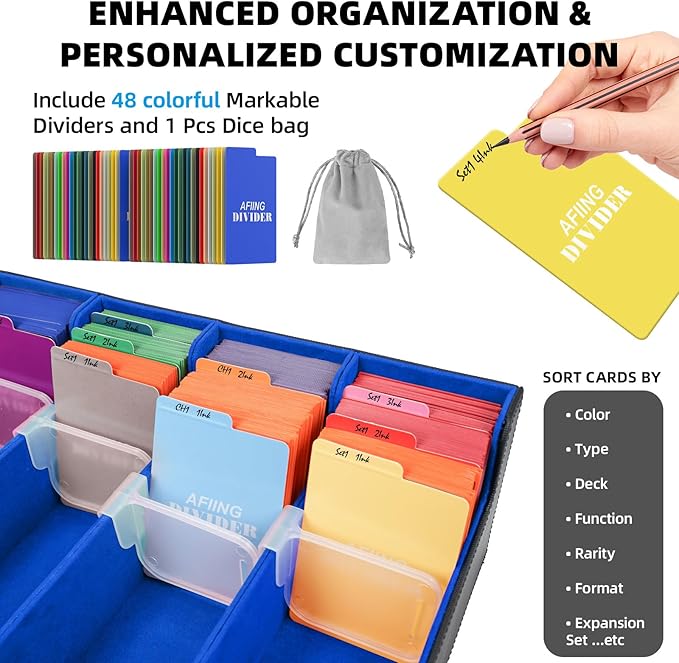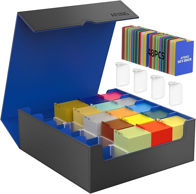 AFIING Trading Card Storage Box, MTG Deck Box with 48 Dividers & Supporters, Commander Card Deck Case Fits for Magic Game Cards, YugiOh, TCG, baseball and Sport Cards, Black Blue 3200+