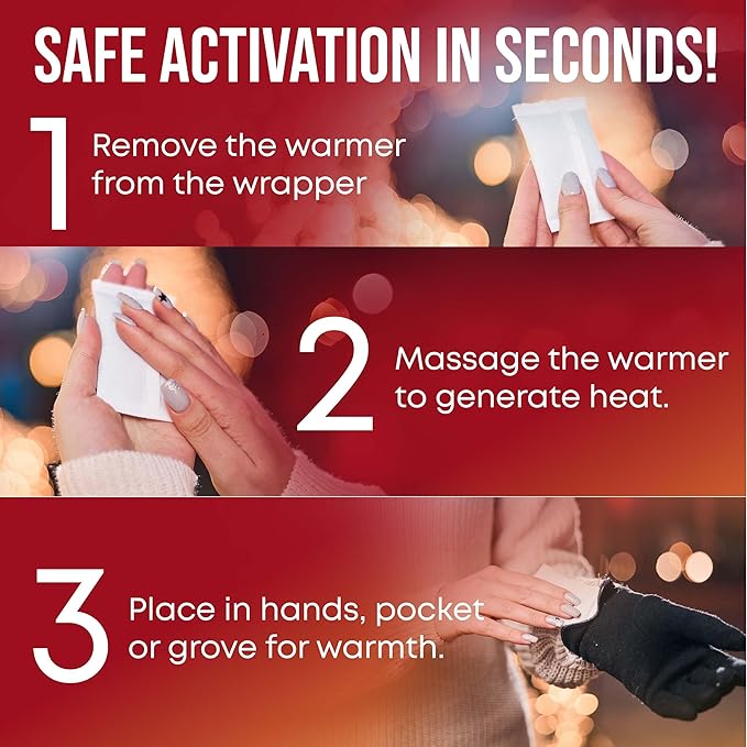 - Safe and Natural Heating Solution: Made with eco-friendly and natural materials, these odorless hand warmers are a safe and reliable way to stay warm without harmful chemicals. Simply shake to activate and enjoy instant heat.