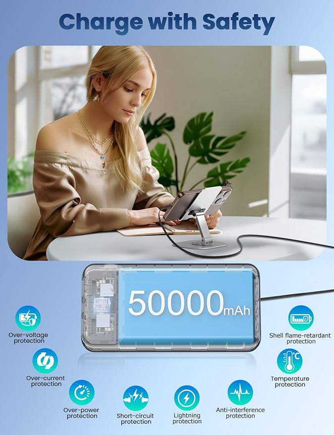 - We're Here to Help:Your convenience is our top priority. Our team offers quick and easy support. Enjoy a 12-month warranty and our commitment to your satisfaction. Your package includes: 50000mAh Portable Charger with built-in cables, Type-C cable for recharging the portable power bank and your devices,and user manual. (Note: No adapter included.)