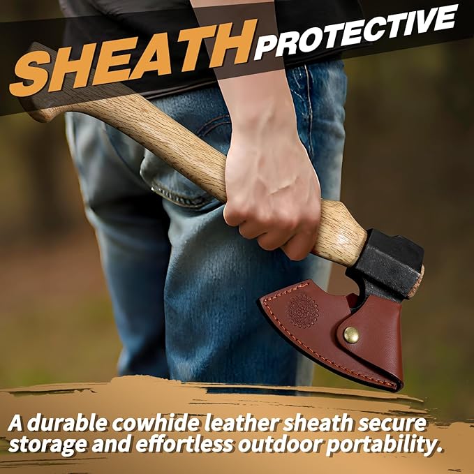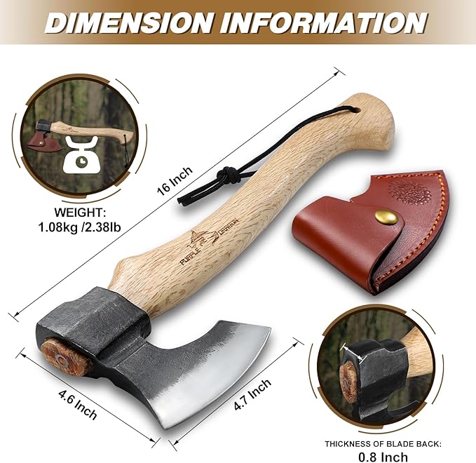 - MULTI-PURPOSE HATCHET: Featuring a blade length of 4.7 inches and an overall length of 16 inches, this compact hatchet axe weighs just 2.38 pounds, making it perfect for both beginners and experienced outdoor enthusiasts. Ideal for chopping, splitting wood, preparing kindling, or even carving intricate designs