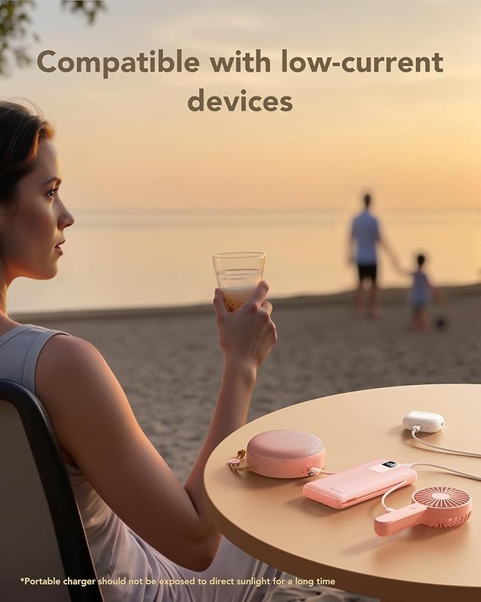 - Universal Compatibility: Features built-in cables for both Apple and Android devices. Supports low-current mode (5V/1A) for safe charging of earphones and portable fans etc, ensuring optimal battery health