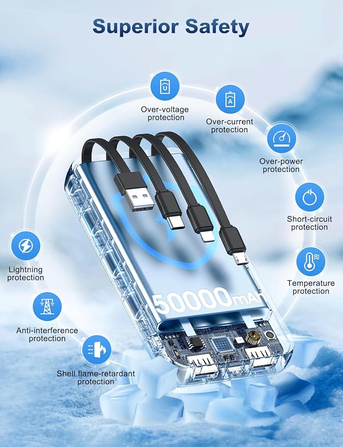 - Charge 6 Devices at Once: OHOVIV 50000mah Portable phone charger with 4 Built-in Cables(Lightning, Type-C, Micro, USB-A) and 3 Charging ports (2 USB-A , 1 Type-C), you can charge up to 6 devices at once without sacrificing power for Ultimate Convenience.These portable charger power bank cables made of high quality materials,withstanding over 10,000 bends.
