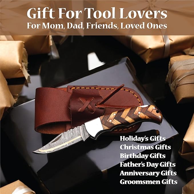 - ๐๐๐ฆ๐ฉ ๐ค๐ง๐ข๐๐ ๐ฐ๐ข๐ญ๐ก ๐๐จ๐๐ค๐๐๐๐ค ๐๐๐ฌ๐ข๐ ๐ง: The lockback mechanism in this folding Damascus pocket knife ensures the blade stays firmly in place when opened, offering enhanced safety and stability for reliable outdoor use.
