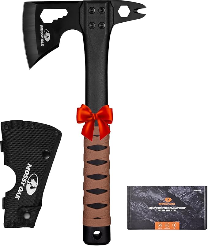 MOSSY OAK 12" Camping Axe and Survival Hatchet with Sheath, Compact Outdoor Multitool Hatchet with Hex Wrench Slots, Non-Slip Dual-Color Handle, Small Camping Gear for Hiking, Chopping, Hunting