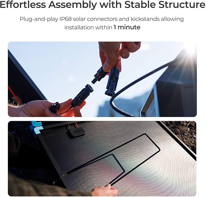 - [1-Minute Setup, Instant Power] Hate complicated gear? This solar panel for camping sets up in 60 seconds—no tools needed! Sturdy rust-proof kickstands keep it stable, while IP68 waterproof connectors ensure reliable power for your RV, van, or emergency backup. The 400W foldable solar panel seamlessly connects to most portable power stations on the market via IP68 solar connectors.