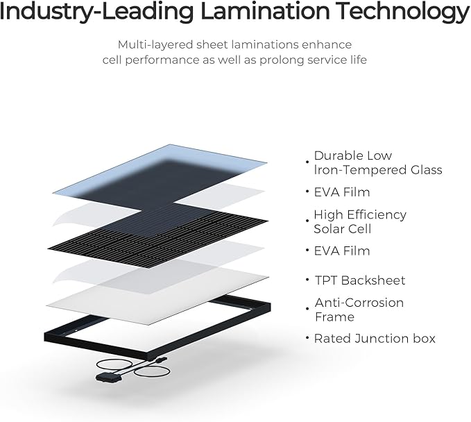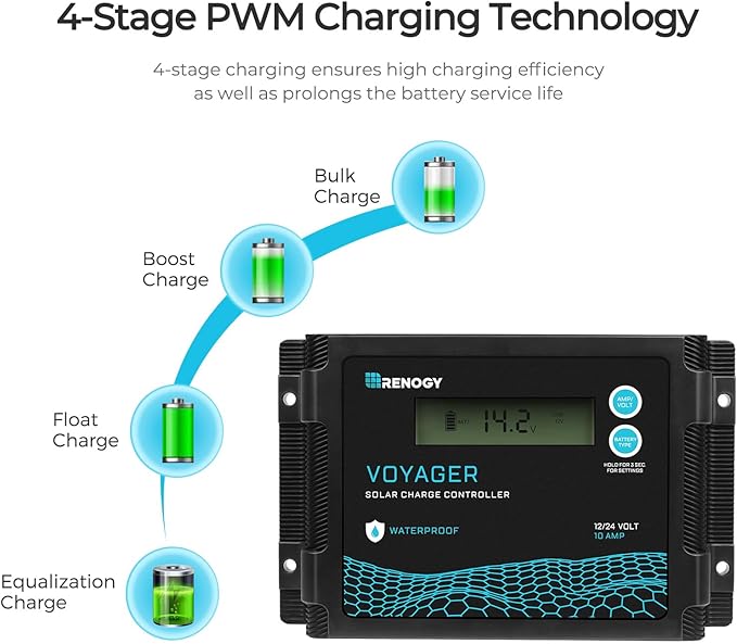 - Exceptional Efficiency: Renogy solar panels using grade A+ monocrystalline solar cells, paired with advanced smart PWM technology in the charge controller to maximize charging efficiency and safety.