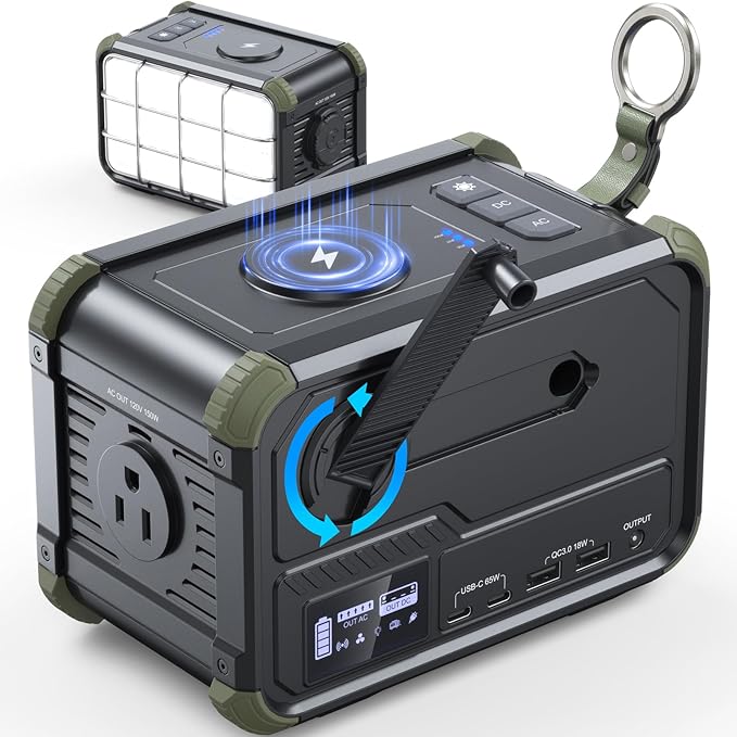 BROWEY Portable Power Station 153Wh Small Solar Generator with Hand Crank 120V 150W AC Outlet Lithium Battery Power Bank, Wireless Charging Emergency Charger for Outdoor Camping Travel Home Backup