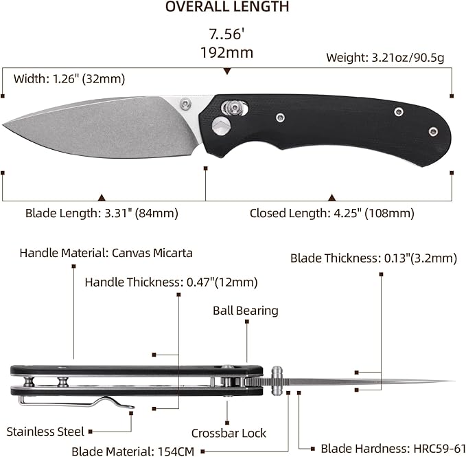 Folding Knife,Pocket Knife,3.31??154CM Blade,Erogonomic Canvas Micarta Handle,Survival Camping Knife with Pocket Clip,EDC Knife for Camping, Hunting, Hiking, Survival,Black