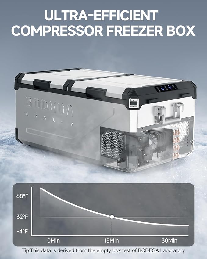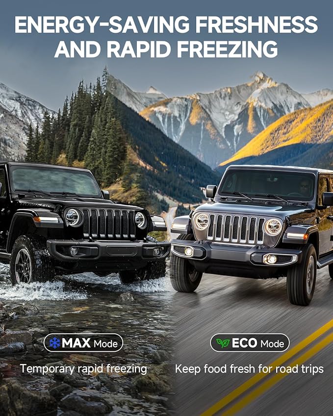 - 【Dual-Path Cooling】 BODEGA Car Fridge have a Switch-On-Fly Modes: MAX (15-min rapid chill) or ECO (40% extended runtime). Meet the needs of fast cooling and long-distance travel.