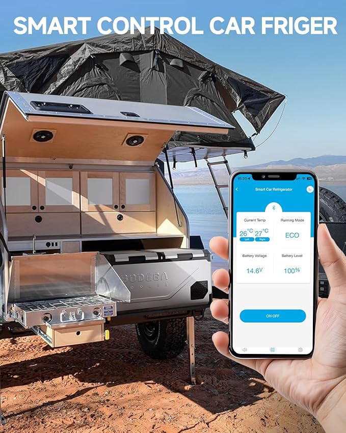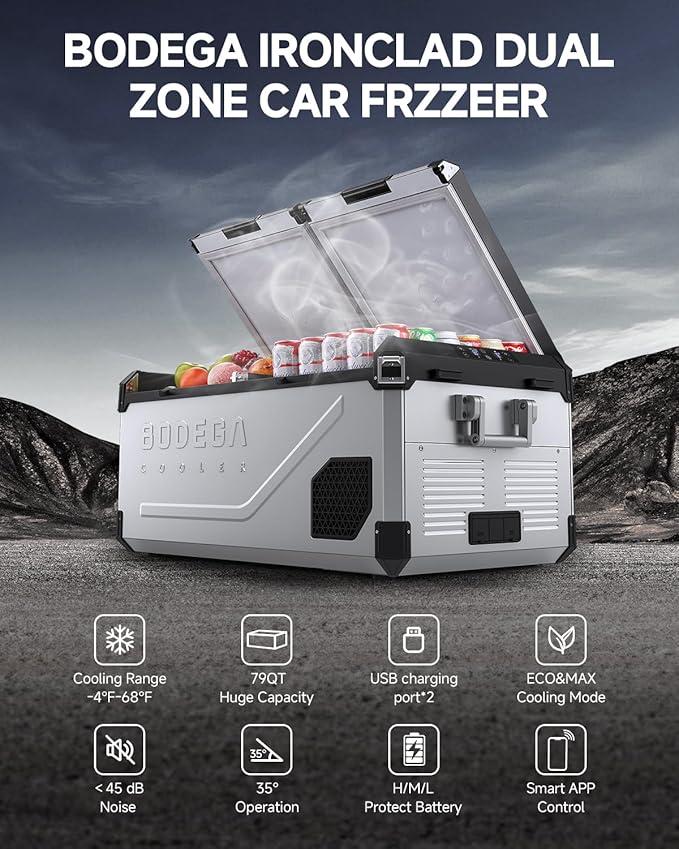 - 【79QT Large Capacity Dual Zone】BODEGA Aluminum Chassis withstands extreme road vibration and impacts. Dual independent zones (L: 48QT / R: 30QT | 79QT Total) maintain precise temps from -4°F to 68°F (-20°C to 20°C). Store 130+ cans, 85+ water bottles, or 30+ wine bottles with zero cross-temperature interference. Assign fridge/freezer roles per zone via App or manual override."