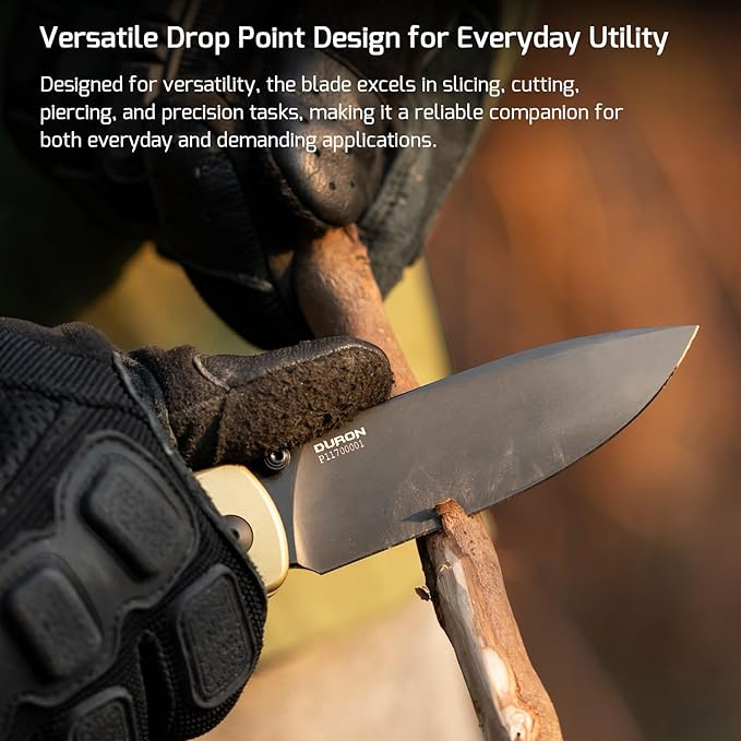- [ Premium Nitro V Steel Blade with PVD Coating ] Equipped with a drop point blade made from Nitro V steel, the Duron delivers exceptional sharpness, edge retention, and corrosion resistance. The high-hardness PVD coating enhances durability and provides a low friction coefficient, making it ideal for cutting, slicing, and handling a wide range of tasks. This advanced coating significantly improves wear resistance while reducing friction, ensuring smooth and efficient performance