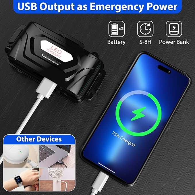- USB Output for Emergency Power: Not just a head lamp, but a powerbank! With built-in USB power out can charge your phone or devices on the go. Perfect for emergencies or outdoor adventures, don't worry about running out of battery anymore.