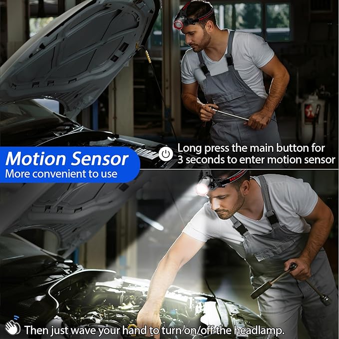 - Motion Sensor: Our led rechargeable headlamp has sensor light beads on the side, long press the main button for 3 seconds to enter sensing mode. Then waving your hand, you can easily control the switch of the headlight.