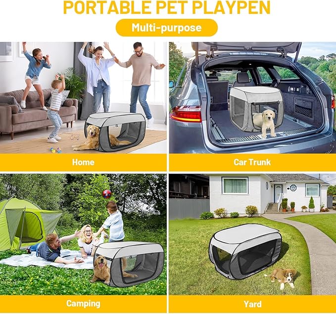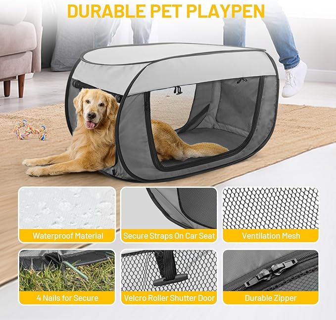 - Safe & Convenient Travel: This foldable dog crate includes seatbelt straps for secure placement in cars, trucks, SUVs, or RVs. It also features 4 tent stakes for stable use on grass, making it ideal for both car trips and outdoor adventures.