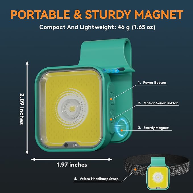 - [Ultra-Light & Sturdy Magnets & Velcro headband] Weighing just 1.65 oz (46g) and measuring 2.09 x 1.97 inches (5.31 x 5 cm), this running lights for runners is lightweight as feather. The magnetic strip allows easily clipped on collars, belts, backpacks, or hats, offering multiple wearable options. Use the included Velcro headband to transform the reflective running gear into a headlamp—ideal for running, working, and fishing. The headband’s high elasticity provides a secure, comfortable fit for any head size. The detachable magnetic strip also allows for direct attachment to iron surfaces, enabling convenient, touchless use