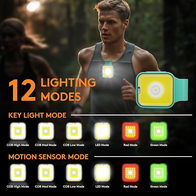 - [12 Modes and Motion Sensor] This running light features 12 versatile lighting modes to suit various needs. It offers COB low/medium/high on white light,and COB red/green,as well as LED spot light. Max brightness delivering up to 500 lumens. The motion sensor mode also provides the same 6 lighting modes, with a blue indicator light that turns on when the sensor mode is activated. Easily switch modes with a press. The motion sensor, using advanced technology, enables touchless control—just wave your hand to turn the light on or off, making it convenient when your hands are occupied or dirty