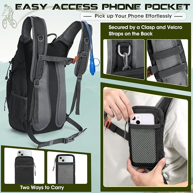 - Hydration-Ready Design: Designed for ultimate convenience, this hydration backpack features a dedicated insulated divider lined with heat-reflective material to keep your water cold for hours, perfect for adding ice pack during summer hikes. The interior features two secure clips to prevent the water bladder from shifting, while the shoulder straps have quick-access tube ports for hassle-free drinking. It comes with a 2L water bladder, perfect for those who need hands-free hydration.