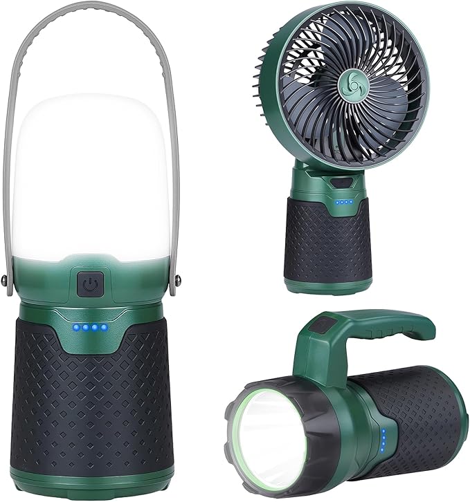 - High-Performance Multi-Function Device: The ultra-bright camping lantern delivers 1000 lumens of 4000K natural white light with four adjustable modes (High/Medium/Low/SOS) to fit any situation. The powerful LED flashlight emits a focused 1200 lumens beam at 7000K cool white with three brightness levels (High/Medium/Low) for long-range visibility. The portable fan tilts 90° and offers three wind speeds, providing refreshing airflow to keep you comfortable during hot outdoor conditions.