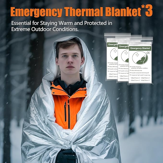 - 【Emergency Thermal Blanket】 Engineered with lightweight & aluminized, weight only 55g, this thermal blanket reflects of body heat to combat hypothermia in freezing temperatures, while its waterproof, windproof design shields against rain, snow, and harsh winds. Beyond warmth, its high-visibility silver surface doubles as a rescue signal to attract attention, and serves as a versatile shelter—deploy it as a ground cover or tent liner. Durable yet , it’s indispensable for hiking, disaster prep.
