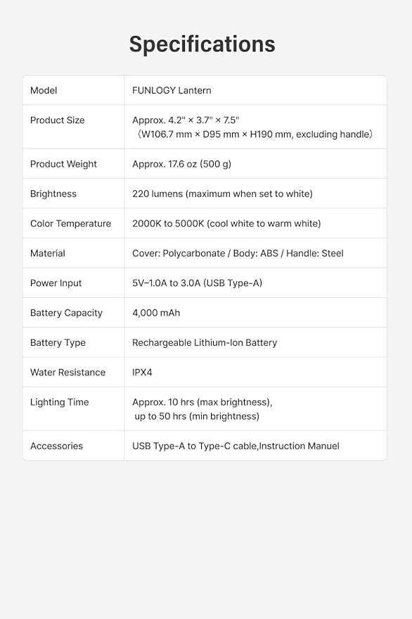 - 50-Hour Power & USB-C Recharge – Built-in 4000 mAh battery runs up to two nights on low and recharges in about 3 h; integrated USB-C output tops up phones when the grid goes down.