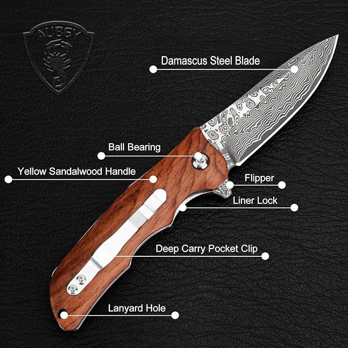 AUBEY Damascus Pocket Knife with VG10 Core, Wooden Handle, EDC Folding Knives for Men Outdoor Camping Collection Gift