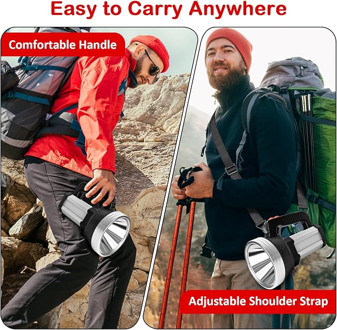 - 👍Portable Bright Camping Light: This handheld LED flashlight rechargable was designed with wide and non-slip handle to ensures a firm grip and prevents slipping, it also features an adjustable shoulder strap so you can adjust it to your size