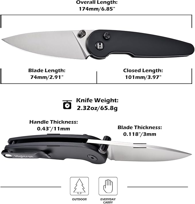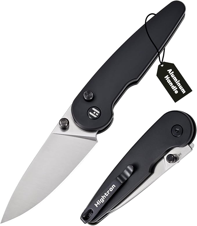 Hightron Birdidi Folding Knife, 2.91" Drop-Point D2 Blade Aluminum Handle, Pocket Knife with Pocket Clip for Camping Survival Hiking Button Lock Knives for Men Women Black-W