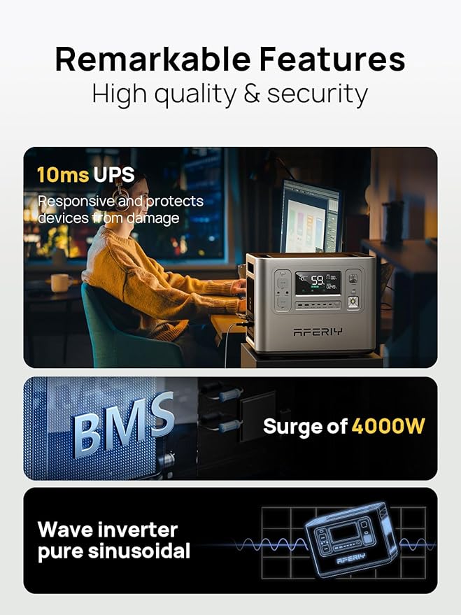 - 2400W Output for All Your Essentials:With a robust 2400W output (4800W surge) and 16 versatile ports, the AFERIY P210 can power everything from full-size refrigerators and medical devices to laptops and portable coolers. Whether you're at home during a power outage, on an RV adventure, or working off-grid, this portable power station is your reliable energy source.