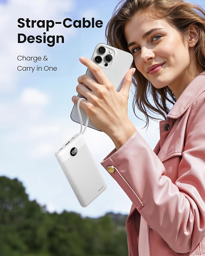 Portable Charger Compatible with iPhone 17, 10000mAh Slim Power Bank with Built-in Cables, External Battery Pack 5 Outputs 2 Inputs LED Display Compatible with iPhone/Android & More (White)