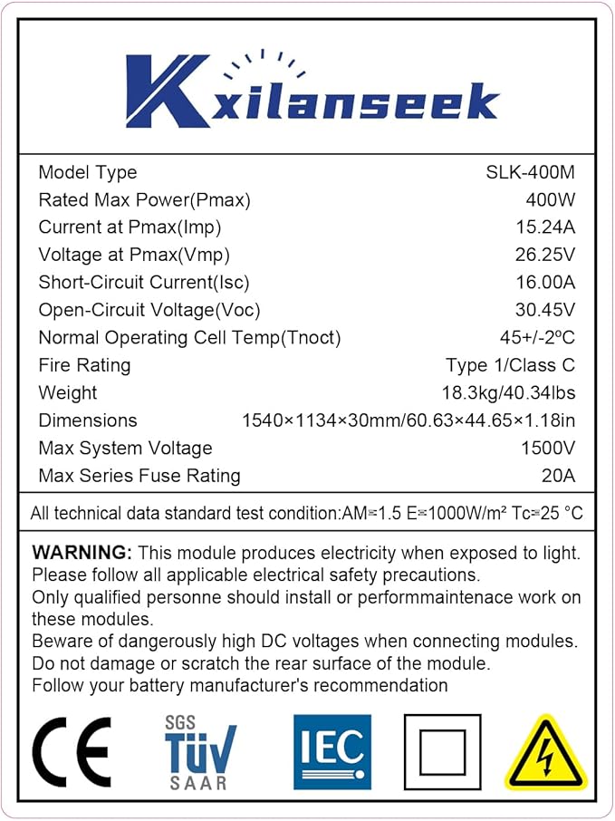- [N-Type 16BB Solar Cells for Superior Performance]Xilanseek 400W solar panel was utilized advanced N-Type 16BB cells for higher efficiency and better shading resistance, ensuring consistent energy production even in partially shaded conditions.