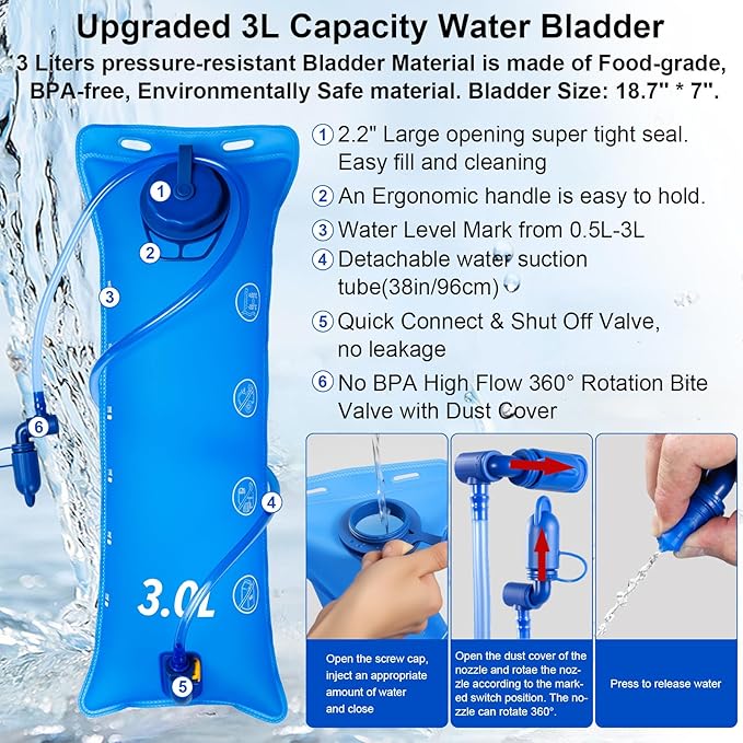 - Professional 3L Large Leakproof Water Bladder - Our 3L(100 Ounce) large capacity water bladder is made of high-quality flexible food-grade material, 100% BPA-free and odor-free. Our water bag features a Large 2.2 in opening that is easy to fill, clean, add ice cubes, and dry. Durable, removable, insulated hydration hose with 360-degree rotatable suck mouthpiece, it's simple to drink. Leakproof bite value, and never drips when locked. The water temperature range is -20~+50℃.