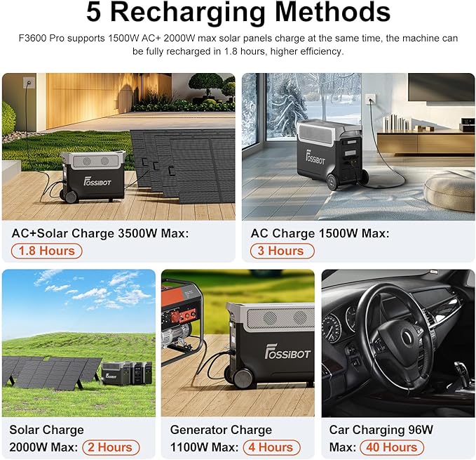 - 【Why Choose FOSSiBOT F3600 PRO?】 This FOSSiBOT 3600 watt power station combines industrial-grade capacity, solar compatibility (solar power generator), and smart features to serve as a portable power station for emergencies, outdoor trips, or daily home use. With its rugged Lifepo4 battery and expandable energy storage, it’s the ultimate solar generator solution for global users.Upgrade to FOSSiBOT F3600 PRO — Power Anywhere, Anytime!