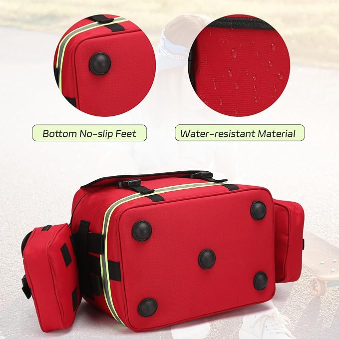 - Medical Storage Bag Size: 14.17 x 9.45 x 9.84 inches, enough for you to store your daily first aid supplies. Made of heavy-duty tear-resistant nylon with good stitching, strong zip, non-slip feet and reflective strips. Provide good protection for your first aid supplies.