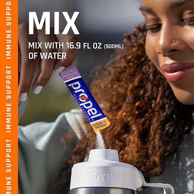 - Includes 3 boxes, each with 10 packets inside (Total 30 packets) of Propel Immune Support Electrolyte Enhanced Water Drink Mix Powder Packets, (1) Lemon Blackberry, (1) Orange Raspberry IS flavored water with 100% DV Vitamin C, Good Source of Zinc, Zero Calories, and Zero Sugar and (1) Lemon Propel Electrolyte Enhanced Water Drink Mix Powder Packet