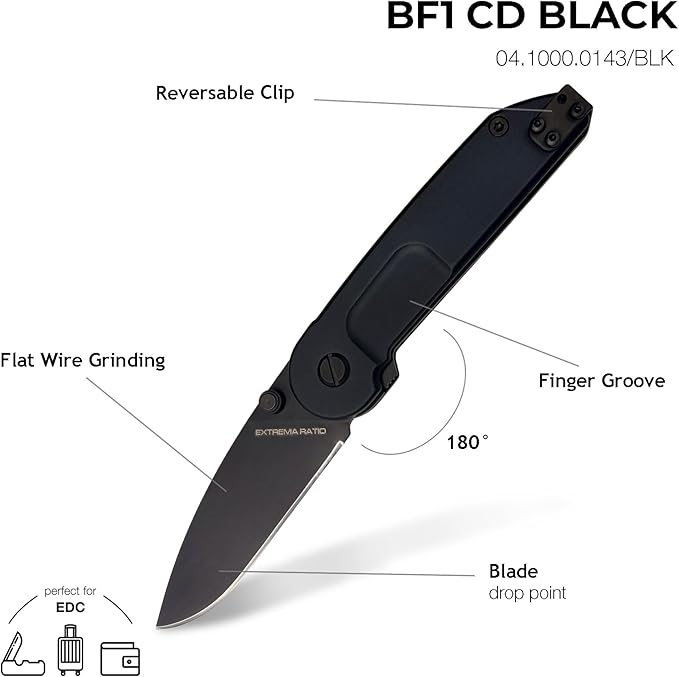 Extrema Ratio - BF1 CD (BLACK), Folding Knife, Böhler N690 steel blade hardened to 58 HRC, burnished finish, anticorodal aluminum handle with smooth grip, compact design, reversible clip