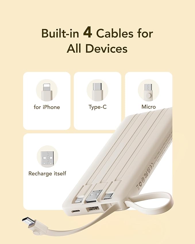 - 【Portable Charger Built-in 4 Cables】Built in cable compatible with iPhone 16/15/14/13/X/XR, Samsung Galaxy S24/S23/S22/S21/S10/S9/S8/Galaxy A51/52/53/54/55/Note 20/10, Google Pixel series, and more USB-C devices. directly charging in anywhere,also built in USB cable for charging power bank itself, you don't need take any cords when going out and travel.