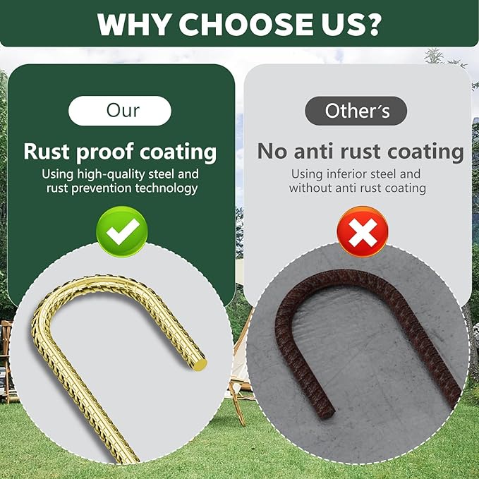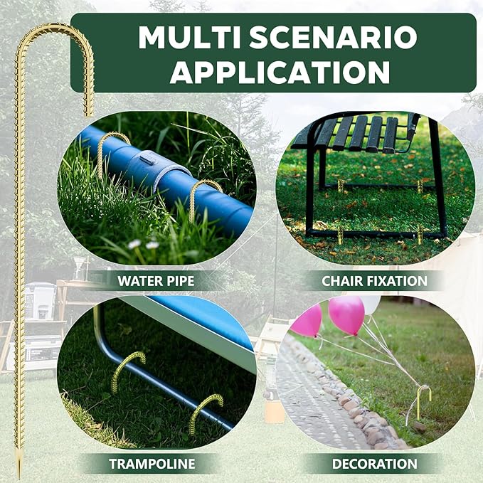 - Wide Applications: Versatile and reliable, our lawn stakes are perfect for a variety of outdoor projects. Whether you're securing tents, tarps, or landscape fabric, trust in their reliability and versatility for all your anchoring needs