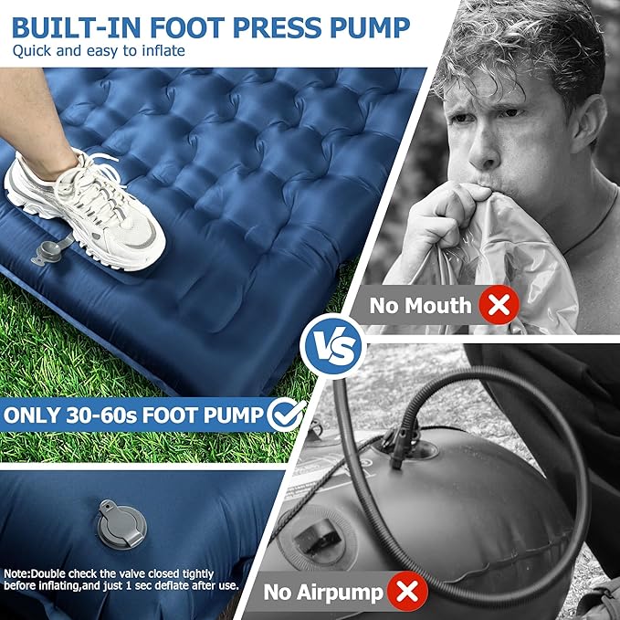 - 【80s Foot Press to Inflate - 1s Deflate】: Upgraded built-in foot pump sleeping mat - Just press the spot of the foot pump with your foot in 80s. NO MORE inflating by hand, mouth or carry a extra pump. Last but not the least, the deflation is easier, just open the air valve. You can add or release air to adjust the sleeping pad's firmness