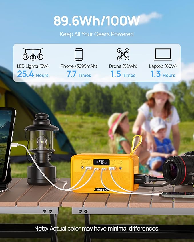 - Powerful 100W Output & 7 Ports: The portable power station comes with a 89.6Wh capacity LiFePO4 battery pack(not NCM) and 100W, features 7 output ports, including 2 AC sockets (100W),2 USB-C port (45W/15W), 2 USB-A port (18W/15W), and DC5521 ports (60W). The LED display can clearly show the working status and remaining power.(Please peel off the protective film on the screen after unboxing)