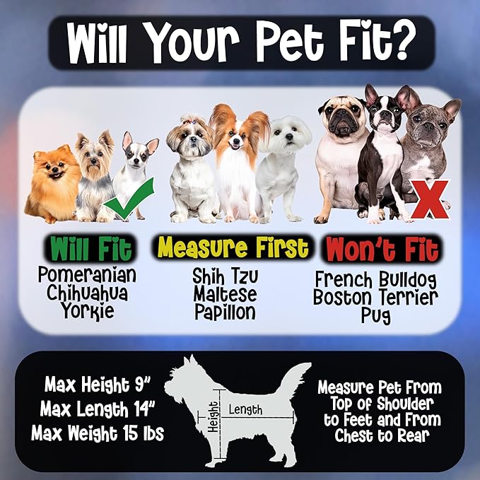 - [MAX HEIGHT 9 INCHES] This is a carrier for small dogs and cats. Maximum height 9 inches, max length 14 inches, max weight 15 lbs. If your pet is larger it will be a tight fit.