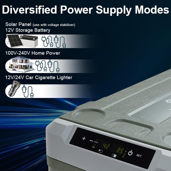 - 【Smart Operation & Versatile Power Options】 This portable freezer is designed for flexibility, supporting 12V/24V DC vehicle power, 110-240V AC, and even battery or solar panel power, making it perfect for various outdoor and travel scenarios. Equipped with a compressor time-delay protection function and a 3-stage battery protection system, it safeguards your vehicle's battery from draining. Whether you're on a road trip or camping, this igloo cooler with wheels ensures reliable cooling wherever you go.