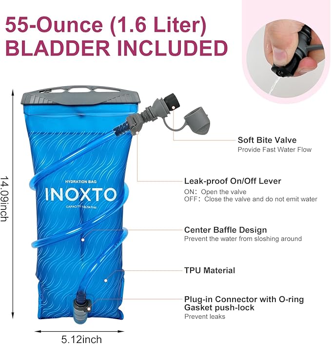 - 【Extensive Applications】Our hydration pack with water bladder is the perfect sports gear you hydrated while running, marathon, cycling, hiking, skiing, climbing, race and training or any adventure outdoors. This running hydration vest can be a are great companions for families and friends. IX INOXTO hydration backpack is always be there for you. If you have any problems, please reach out to us, we will reply within 24hrs.