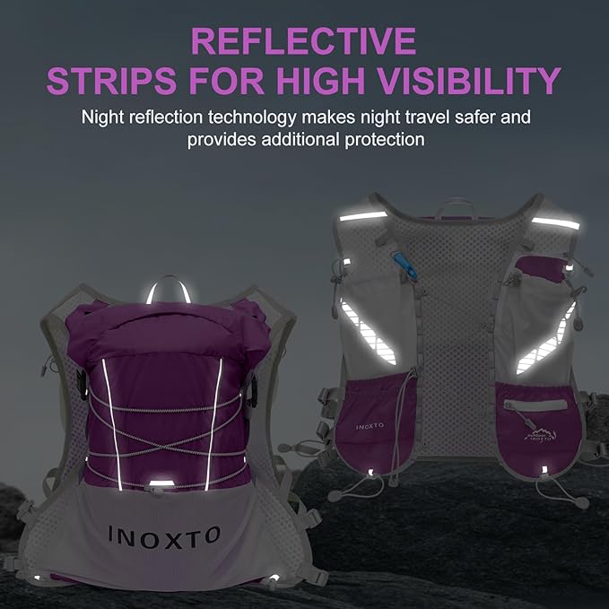 • 【Highly Durable & Lightweight】IX INOXTO hydration vest is made of waterproof and wear-resistant nylon fabric with a lotus leaf-like waterproof effect. Pack size of 14.5 x 9 x 5.1 inch, The weight only 0.65 lbs and capacity of 10L are the perfect match for short trips, satisfy your thirst for adventure. Reflective logo and strip on the front and back increase safety in low-visibility scenarios. This reflective running vest makes every run farther, safer, and more comfortable.