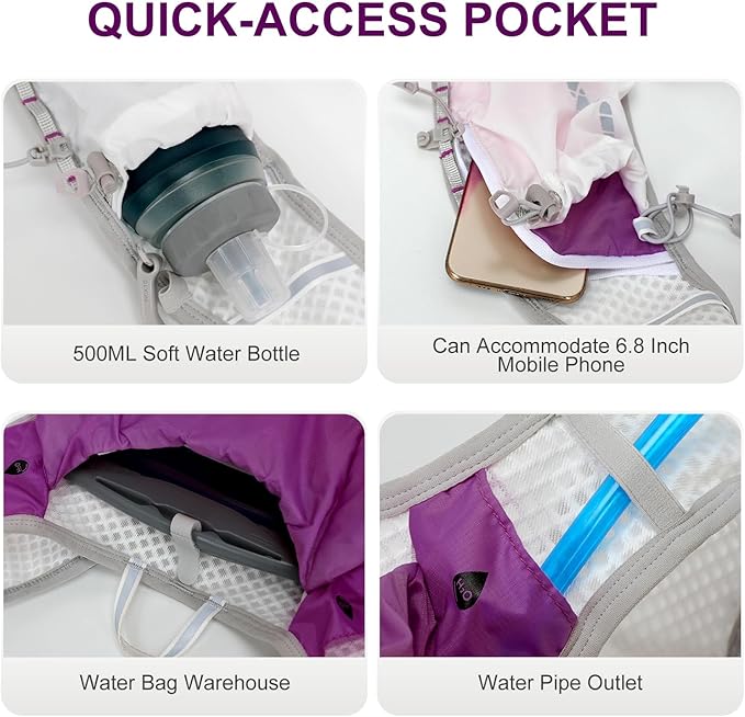 • 【Plenty of Storage】This running vest comes with multiple pockets, designed to accommodate your gear and valuables conveniently and securely. Your phones, key, cash, snacks can be easily stored in the seven front storage pockets, and hydration bladder, towels, or any other items can be placed in the main compartment (separate water bag compartment). Quick and Easy access to pick all your necessaries during running or cycling, get all your gadgets well organized in your front pocket.