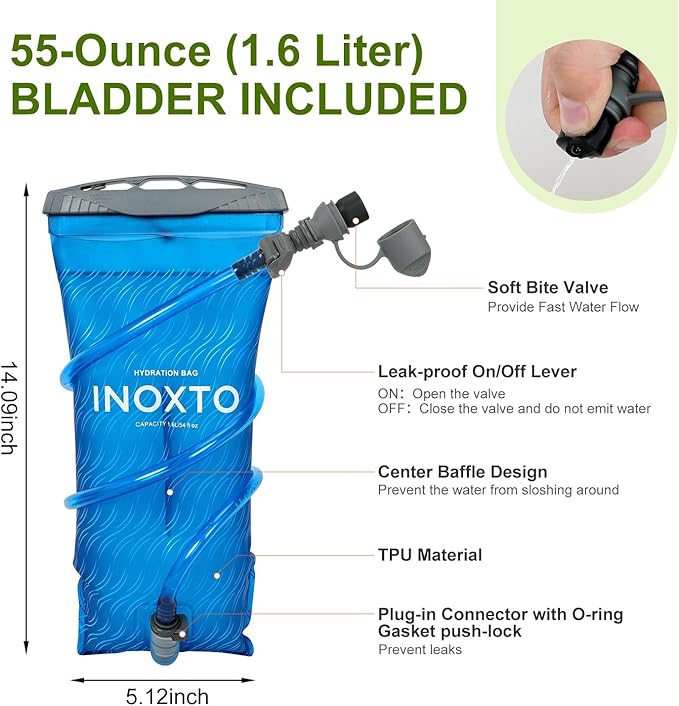 • 【Extensive Applications】Our hydration pack with water bladder is the perfect sports gear you hydrated while running, marathon, cycling, hiking, skiing, climbing, race and training or any adventure outdoors. This running hydration vest can be a are great companions for families and friends. IX INOXTO hydration backpack is always be there for you. If you have any problems, please reach out to us, we will reply within 24hrs.