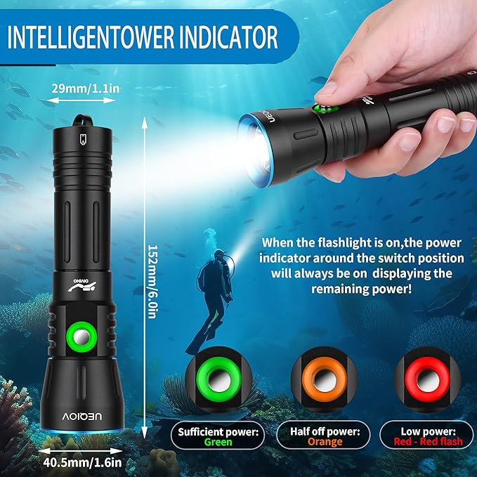 - 【⛹️Smart diving flashlight with four modes】One-key switch between high/centre/low/SOS four lighting modes to meet different underwater scene needs.-in intelligent battery indicator, green light (>30%)/orange light (10-30%)/red light flashing (<0%), to help you plan your diving trip reasonably.