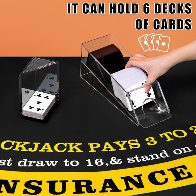 - Black Jack Table Set: package includes 1 piece of 6 deck card shuffler, equipped with a USB cable, 1 piece of blackjack dealing, 1 piece of blackjack discard holder, 1 piece of blackjack layout felt and 10 pieces of cut cards; Nice combination to meet your demands
