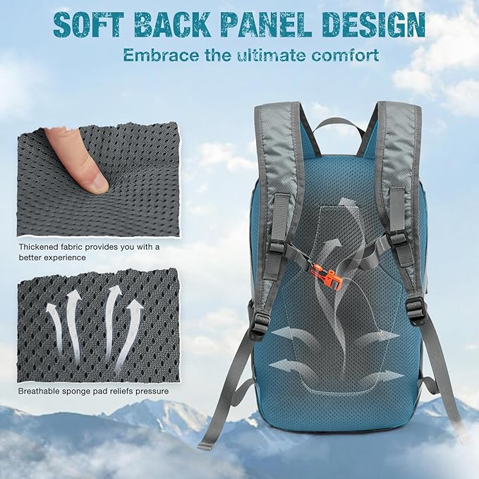 - 【Packable and 20L Large Capacity】This hiking backpack is easy to fold up into its inner pocket, the folded size is only 7.9*6.3 inches, easily packed in your luggage. Its expanded dimensions are 10.6*6.1*16.9 inches, which makes it spacious enough to accommodate a variety of personal items.