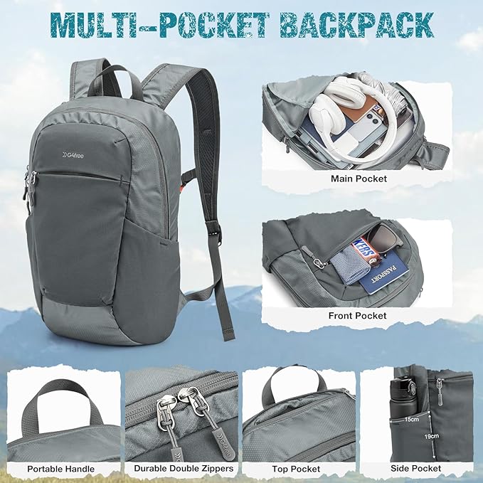 G4Free Packable Hiking Backpack 20L Lightweight Foldable Travel Daypack with Thickened Back Panel for Men Women(Grey)