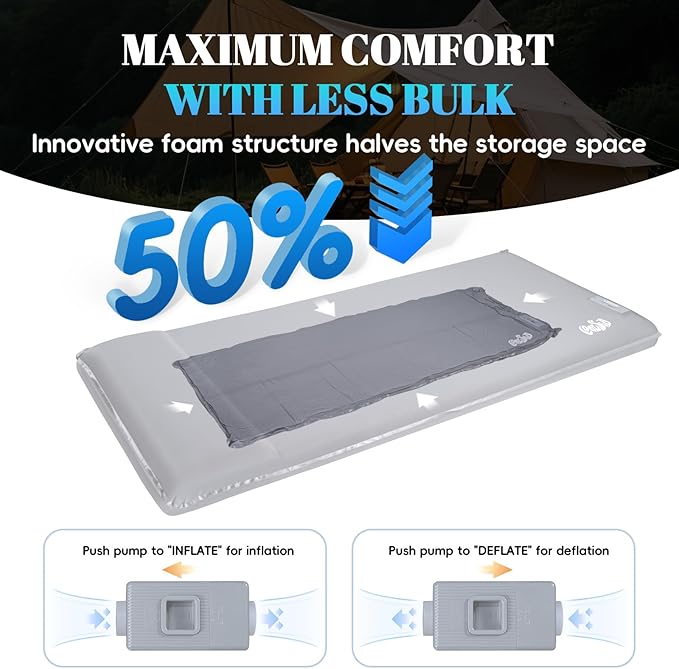 - 【HI-TECH MEMORY FOAM CAMPING MATTRESS】This automatic inflatable sleeping pad with a pillow features a high-tech memory foam design and is suitable for various sleeping positions. Whether sleeping on the back, on the side or on the stomach, it can fit the body curves very well. The inflatable mattress not only remains soft but also has support, bringing a comfortable sleep experience to the travel.